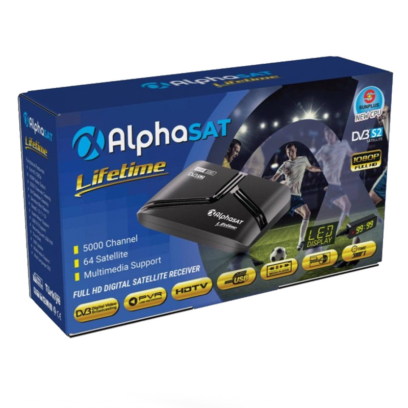 Récepteur AlphaSat Lifetime - Résolution : Full HD 1080 - Comptabilité: Wifi, DVB, PVR, HDTV, USB 2.0, Media player, DiseqC 1.2 - 5000 Channels - 64 Satellite - MultiMedia Support - Display LED - Voltage : 100-240 V - Fréquence : 50 Hz - Dolby Digitale